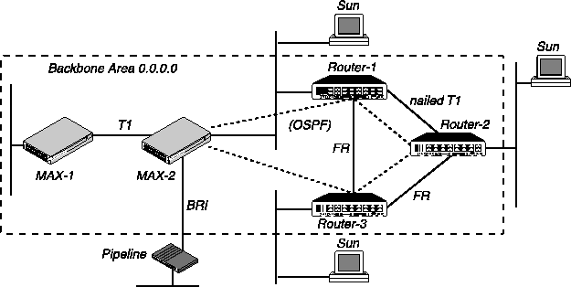 The MAX acts as an OSPF internal router with limited border router capability. At this release, we do not recommend an area border router (ABR) configuration for the MAX, so the Ethernet interface and all of the MAX WAN links should be configured in the same area.