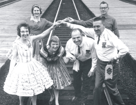 As a footnote, my husband Fred insists I include the following. Besides assigning the train with the lowestpriority, the CN officials who provided the rolling stock were mindful, it was rumoured, of the many Grey CupSpecials they had made up and had wrecked by revelers over the years. So they gave us the very oldest and worstequipped cars they could find - and laid on a huge stock of alcoholic refreshments, finding to their utter astonishmentthat 325 people could all have the time of their lives for two weeks with no more than tea, coffee and fruit juice! Ah!We hardly noticed the dilapidated accommodation. We were high on the sheer joy of dancing from end to end of thisgreat country when square dance itself was hitting its peak.