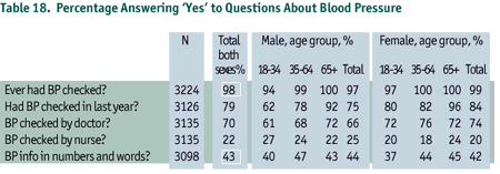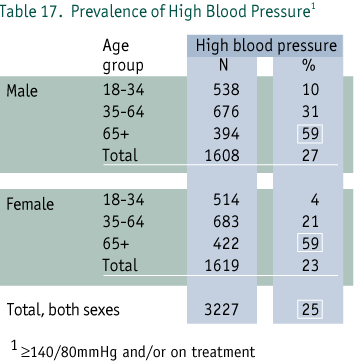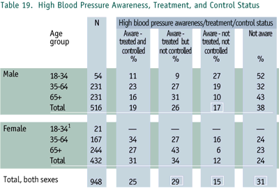 Given that uncontrolled high blood pressure puts people at risk for heart disease and stroke, it is important to know whether the 25% of Nova Scotians with elevated blood pressure were being treated and controlled (blood pressure brought to less than 140/90 mmHg). Of the 948 men and women with high blood pressure, a full 75% had not achieved control. Reasons for this high rate of uncontrolled high blood pressure included: 31% of affected individuals were unaware of their condition, 15% were aware but had received no treatment (more males than females were in this group, p < 0.05), and 29% were aware but treatment had not been successful (Table 19).