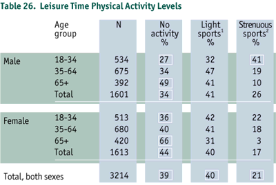 Sixty-one percent of adults reported engaging in some leisure time physical activity, while 39% reported no such activity. Females were more likely to be sedentary than males (p < 0.05), and sedentary living increased with age such that in the over-65 age group, 49% of men and 66% of women were inactive. Generally, men were more active during their leisure time than women at all ages, and young men reported much higher levels of strenuous activity. However, a high percentage of young men (27%) and women (36%) age 18- 34 were sedentary (Table 26).
