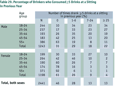 In order to investigate the level of heavy drinking, respondents were asked the number of times they consumed five or more drinks on one occasion in the past year, and more men (69%) than women (39%) reported this behaviour (Table 29). The majority of women who reported this level of drinking, indicated a low frequency of one to six times in the previous year. Men reported drinking heavily much more often, with 22% indicating a frequency of 25 or more times in the past year. The proportion of men who reported drinking heavily decreased with age. The data suggest that although drinking frequency increases with age for men, the number of drinks per occasion decreases.