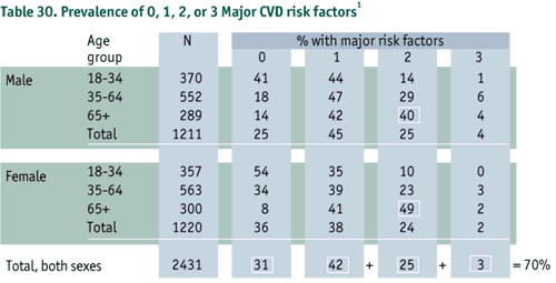 It is known that the presence of one CVD risk factor increases the chance of developing CVD. Further, having two or more risk factors simultaneously causes an amplification of each individual risk with the net effect being an even greater chance of developing CVD (Martin, Hulley, Browner, Kuller,&Wentworth, 1986; Rose, 1981; Stamler, Wentworth&Neaton, 1986).
