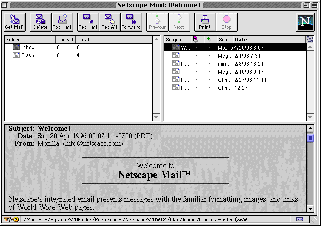 The lower frame of the window shows the beginning of an Email message from "info@netscape.com" which I can scroll through and read.